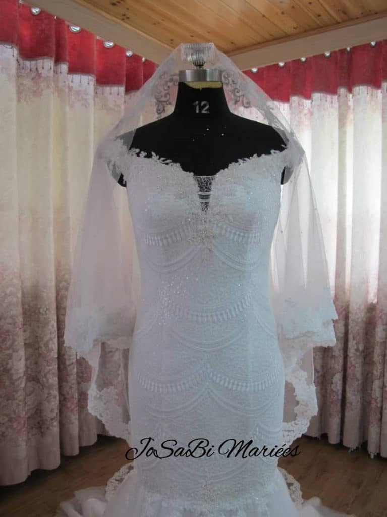Fait amusant: j’étais une blogueuse de mode en parallèle (j’ai fait preuve de beaucoup moins d’assiduité depuis le début de JoSaBi). Le jour de mon anniversaire de mariage en 2017, j’ai posté un séance photo avec mes propres robes de mariée JoSaBi personnalisées comme une petite promenade dans le passé. Laeti m’a contacté sur Instagram, m’a dit qu’elle adorait le savoir-faire de mes robes et qu’elle chercherait bientôt sa propre robe de mariée. Pour sa robe, Laeti savait déjà qu’elle voulait être incroyablement chic, avec une aura de féminité et un soupçon de sexy. Elle cherchait une robe de mariée sur mesure de forme sirène, bien ajustée et faite d’une dentelle unique. Pour ses accessoires, elle voulait un voile de longueur chapelle. (Après avoir échangé quelques idées, nous avons aussi décidé d’ajouter quelques détails en dentelle et une pluie de perles sur son voile, pour un soupçon de brillance.) Pour sa couleur, elle s’était décidée sur le blanc pur.